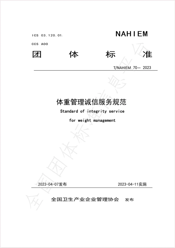 隨著我國"健康中國2030"戰(zhàn)略的深入推進,2024年啟動的“體重管理年”活動標志著體重健康管理已上升為國家健康戰(zhàn)略的重要組成部分。在當(dāng)前減肥產(chǎn)品市場快速增長的同時,我們更要清醒認識到:規(guī)范行業(yè)發(fā)展、保障消費者權(quán)益已成為當(dāng)務(wù)之急。為此,高度呼吁體重管理企業(yè)/機構(gòu)積極參與《體重管理誠信服務(wù)規(guī)范》(T/NAHIEM 70-2023)團體標準的執(zhí)行。