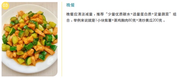 也可以準(zhǔn)備一個(gè)“411”分格餐盤:1/2蔬菜(除了淀粉類蔬菜如土豆、山藥、玉米等,其他蔬菜可以自由選擇)+1/4優(yōu)質(zhì)蛋白質(zhì)(雞蛋、雞胸肉、瘦牛肉、魚肉及大豆制品等)+1/4優(yōu)質(zhì)碳水(雜糧飯、紅薯、玉米、山藥等),1天食鹽攝入量不超過5克,食用油選擇植物油,且不超過25克。